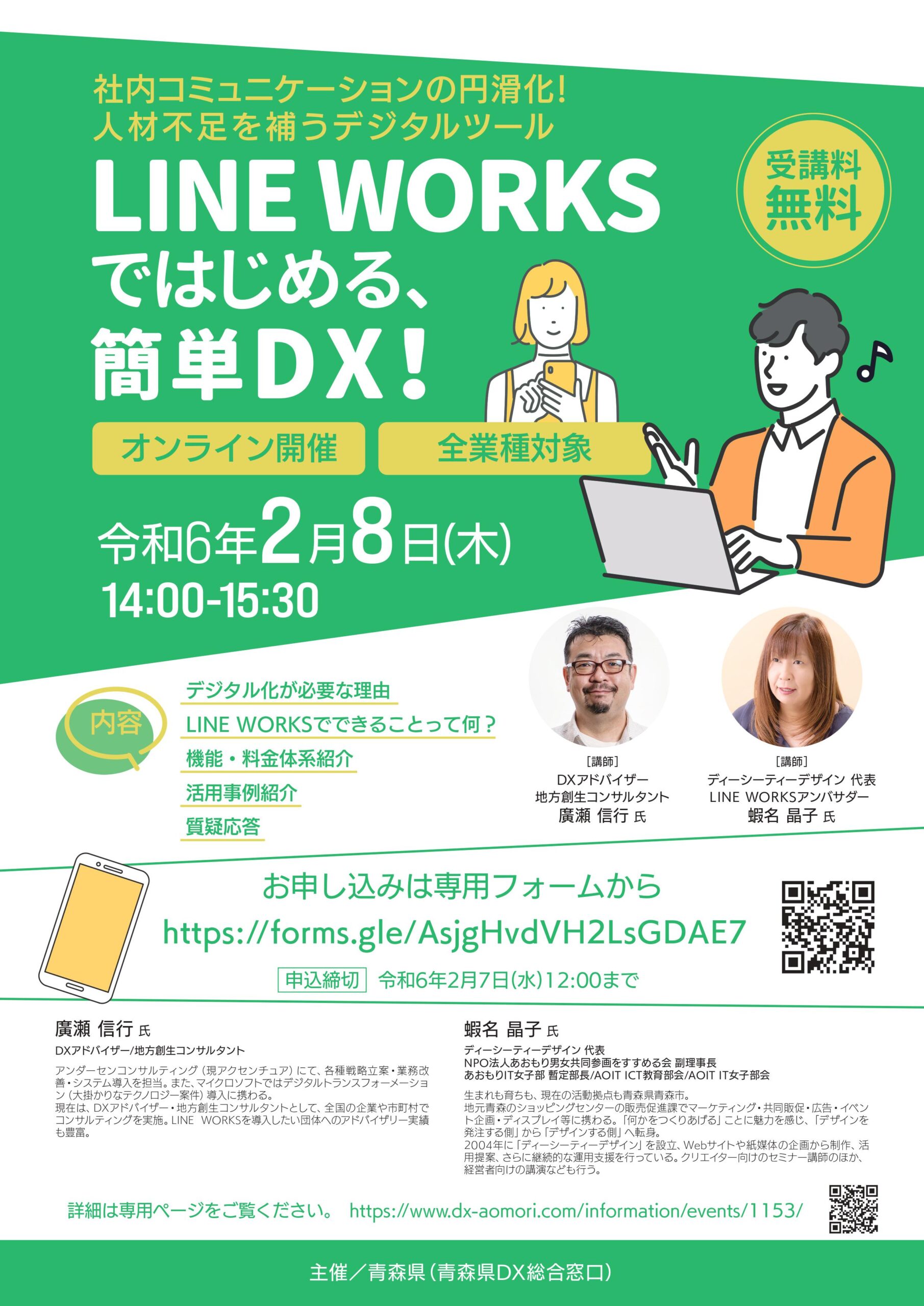 ディーシーティーデザイン 代表・LINE WORKSアンバサダー 蝦名晶子氏とDXアドバイザー・地方創生コンサルタント 廣瀬信行氏のお2人を講師にお招きしてLINE WORSを活用した「簡単DX化」と「人材不足を補うツール」の活用方法をご講演いただきます。