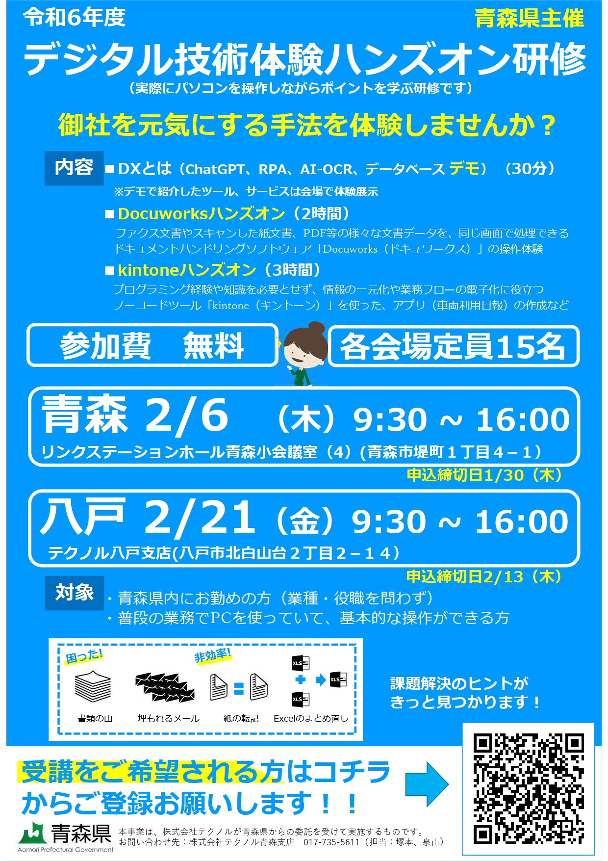 このため、青森県DX推進課では、県内事業者におけるデジタル技術担当者等を対象に、デジタル化のハードルを下げるノーコードツール等の体験を通じて、デジタルツールの利便性を実感し、自社の業務効率化や生産性の向上に取り組むための実践的なスキルを身に付けることを目的とした研修を実施します。